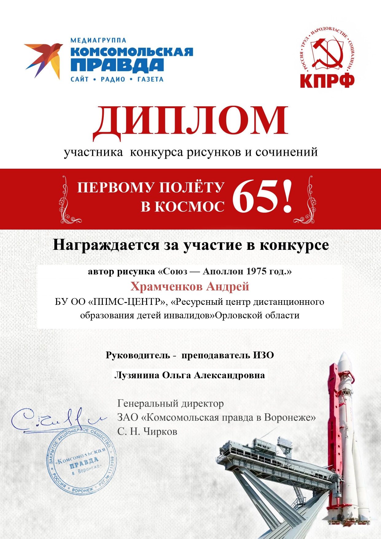 Поздравляем участников конкурса рисунков и сочинений «Первому полету в космос 65!»
