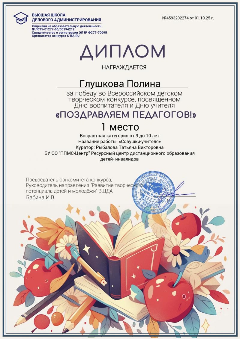Подведены итоги Всероссийского детского творческого конкурса «Поздравляем Педагогов!», проводимого Высшей школой делового администрирования.