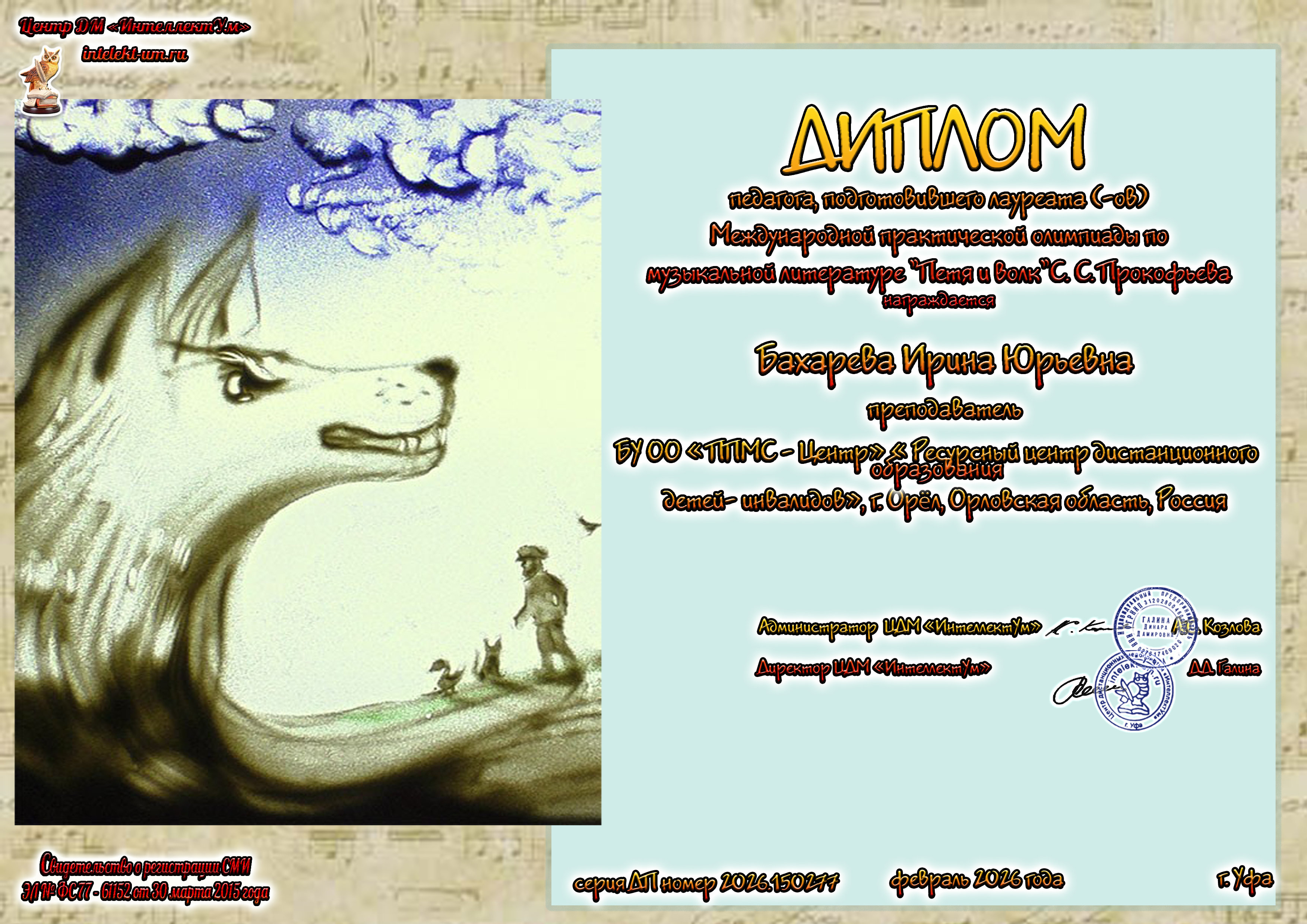 Поздравляем победителя Международной практической олимпиады по музыкальной литературе «Петя и волк» С.С. Прокофьева Коновалова Федора и педагога Бахареву Ирину Юрьевну!