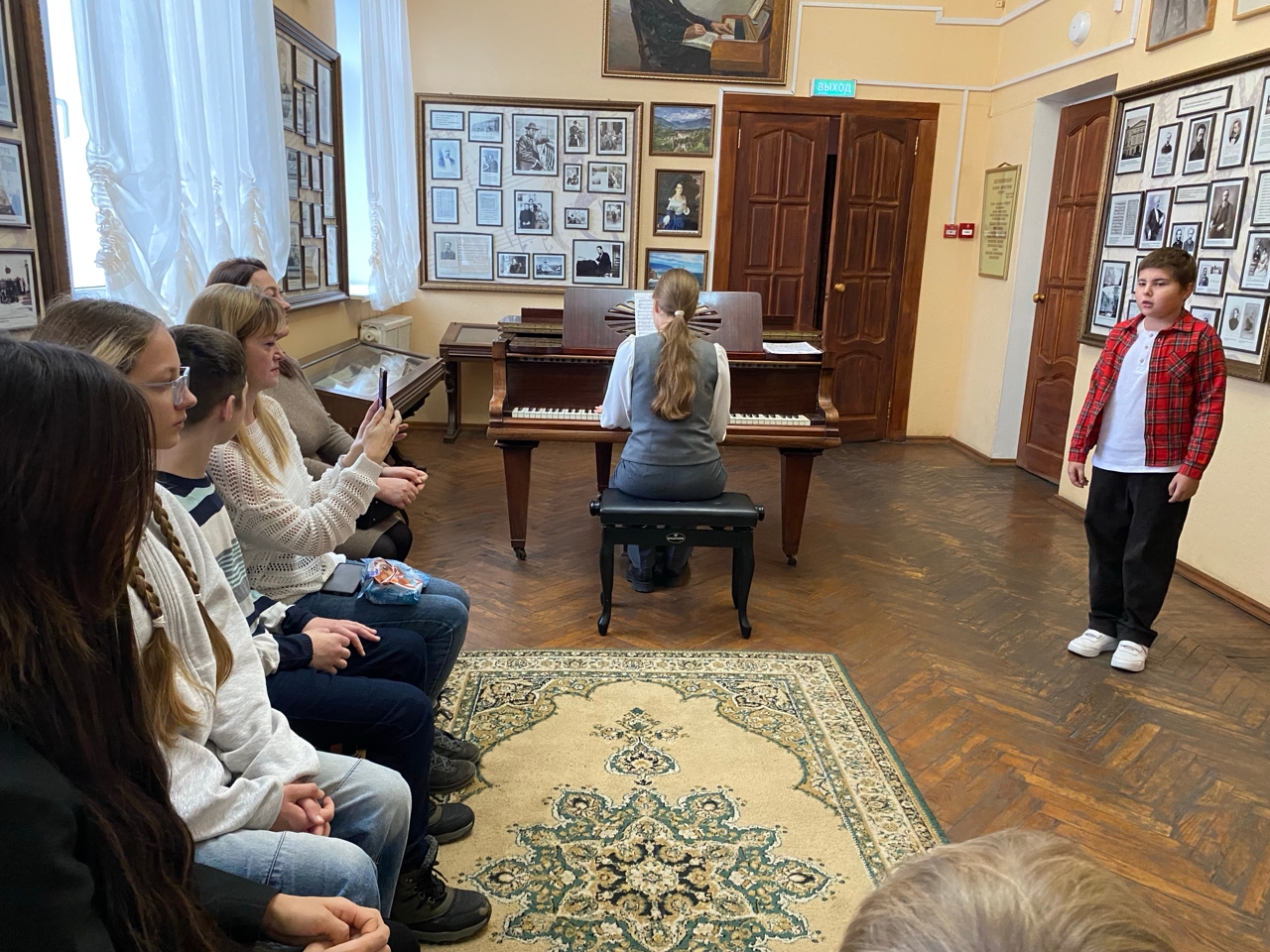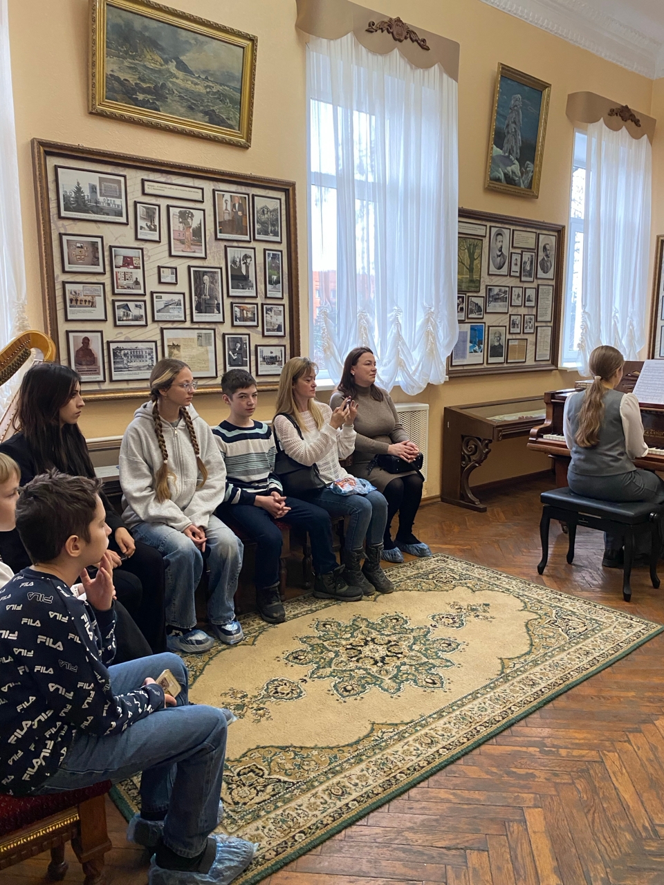 Познавательную экскурсию по единственному в России музею В.С. Калинникова провела педагог школы Герман Г.Н. Галина Николаевна показала витражи с портретами знаменитых композиторов, бюст Василия Сергеевича, рассказала о биографии нашего земляка и организовала музыкальную гостиную. Воспитанники школы выступили с яркими номерами, исполнив не только произведения братьев Калинниковых, но и В. Шаинского, Дж. Гершвина, Е. Дербенко и других.