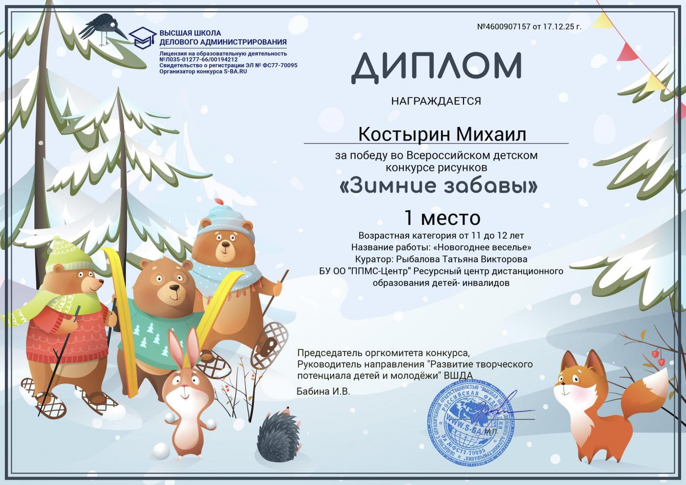 Подведены итоги Всероссийского детского конкурса рисунков «Зимние забавы», проводимого Высшей школой делового администрирования. Поздравляем победителей!