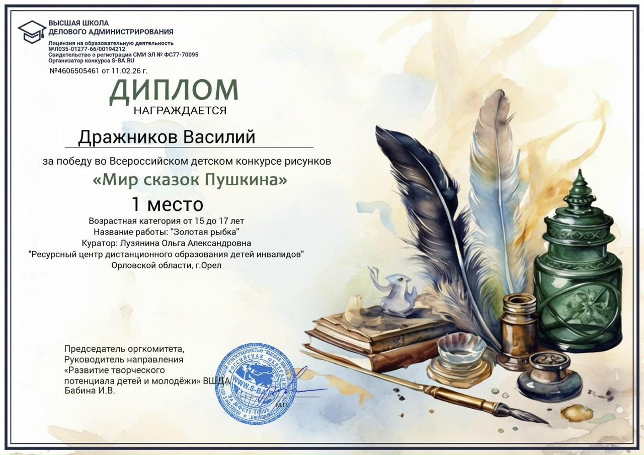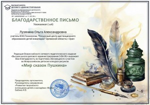 Поздравляем победителей Всероссийского детского конкурса рисунков «Мир сказок Пушкина» и педагога Лузянину Ольгу Александровну!
