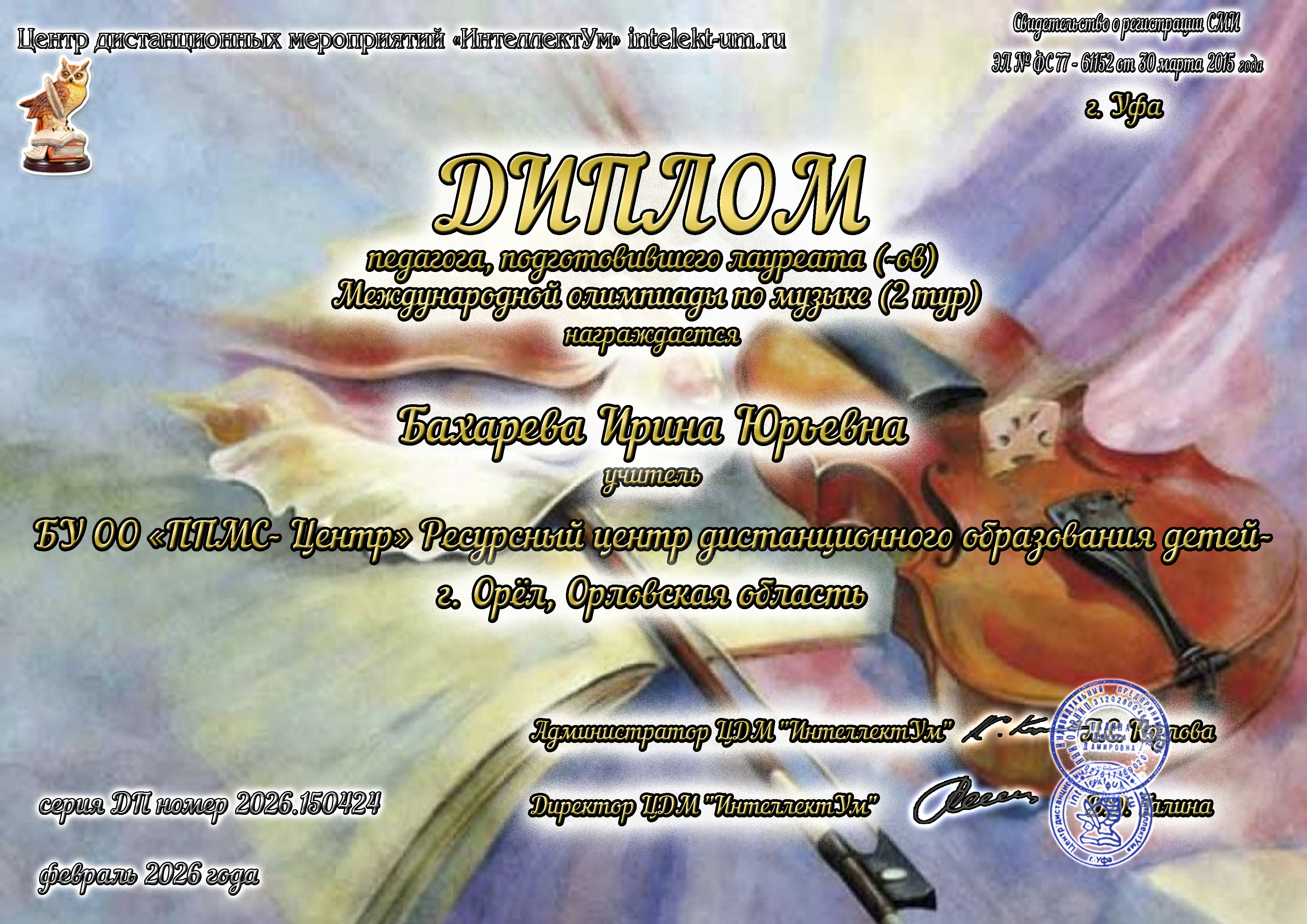Поздравляем победителя Международной олимпиады по музыке Костырина Михаила и педагога Бахареву Ирину Юрьевну!